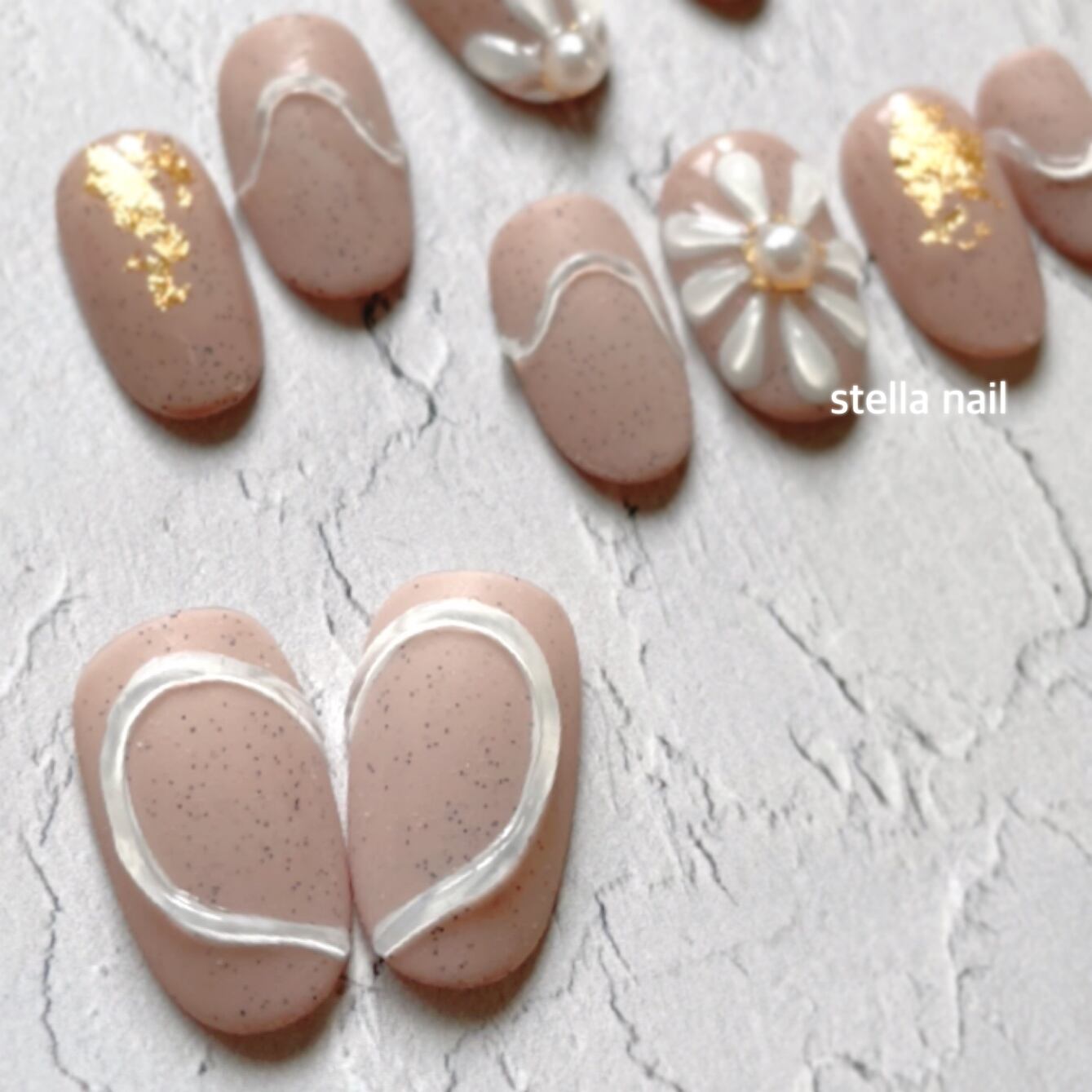 優しいベージュのサンドネイル(砂が入ったようなジェル)をベースにぷっくりお花と金箔のアートが入ったネイルです♪